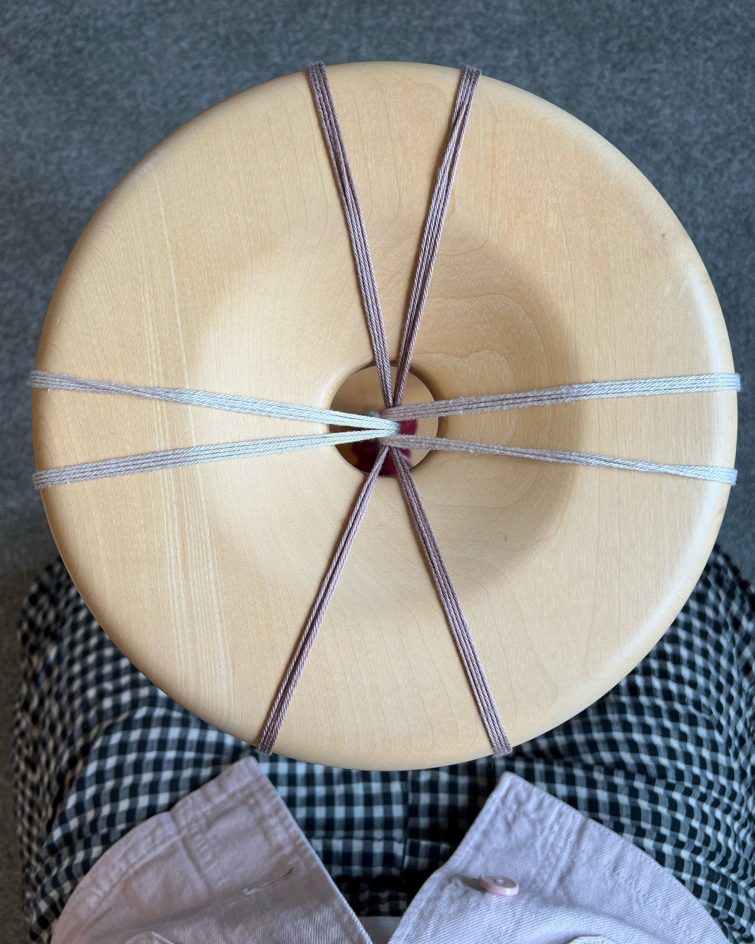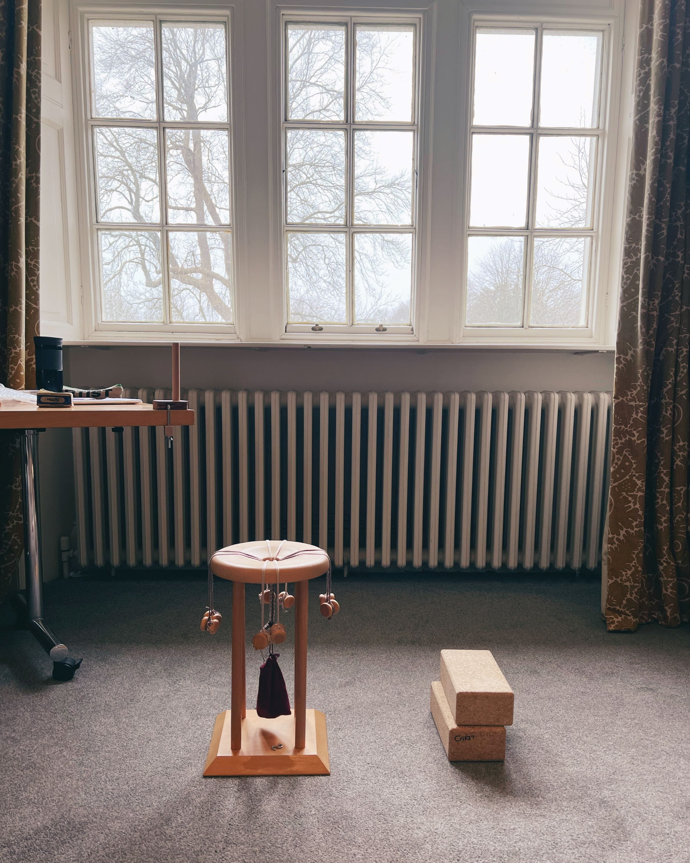 The course group is small and our tutor Jacqui generously shares her knowledge with a calm and steady patience. It feels like discovering the tip of an iceberg, it also starts to feel like we’ve started a yoga or meditation session. After walking us through the process of loading up thread onto each spool, or kumidama, she invites us to place ourselves in the traditional seated position, seiza. With the help of a few cork yoga blocks (to keep my feet from going numb) I sit myself on the floor facing the marudai. Next we are asked to consider our position. As my marudai is made from wood, Jacqui suggests I line up the natural grain like the directions of a compass; north, east, south, west. It’s a grounding and embodied ritual, encouraging us to be intentional in what we are about to create. It’s also a very practical way to keep track of the order of the braid.